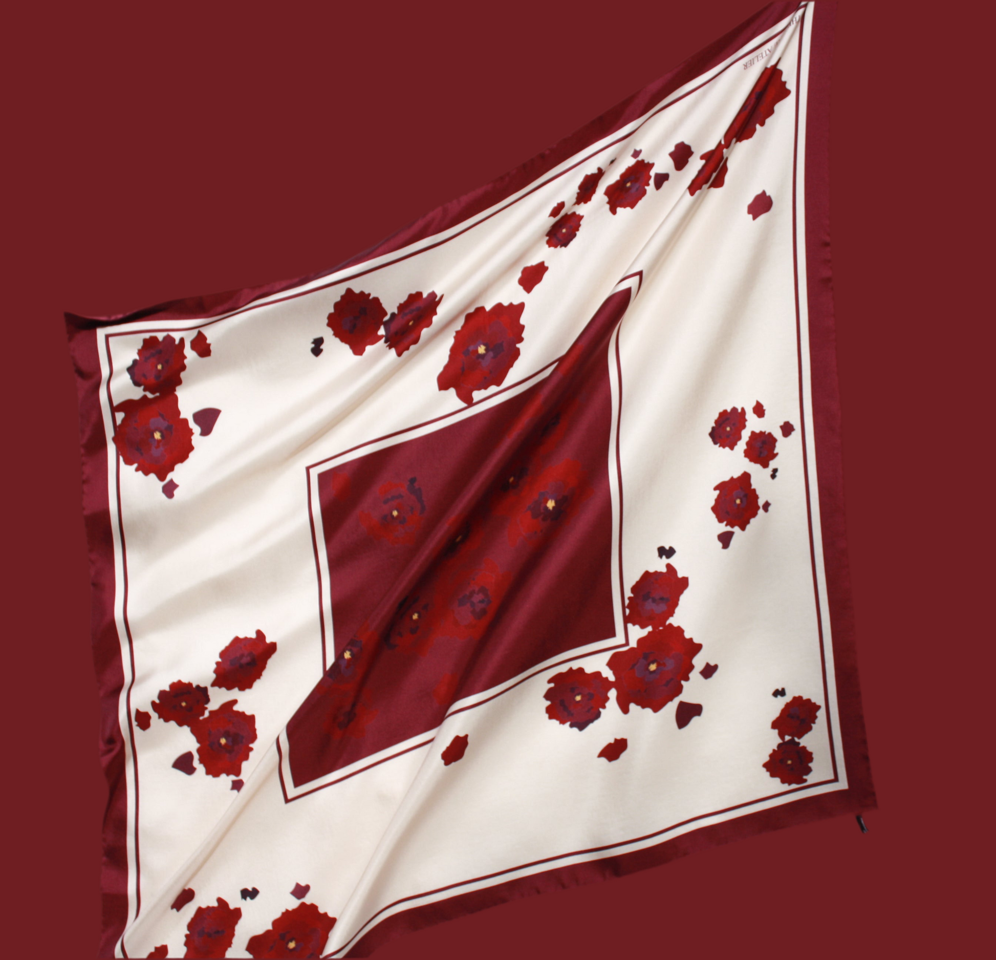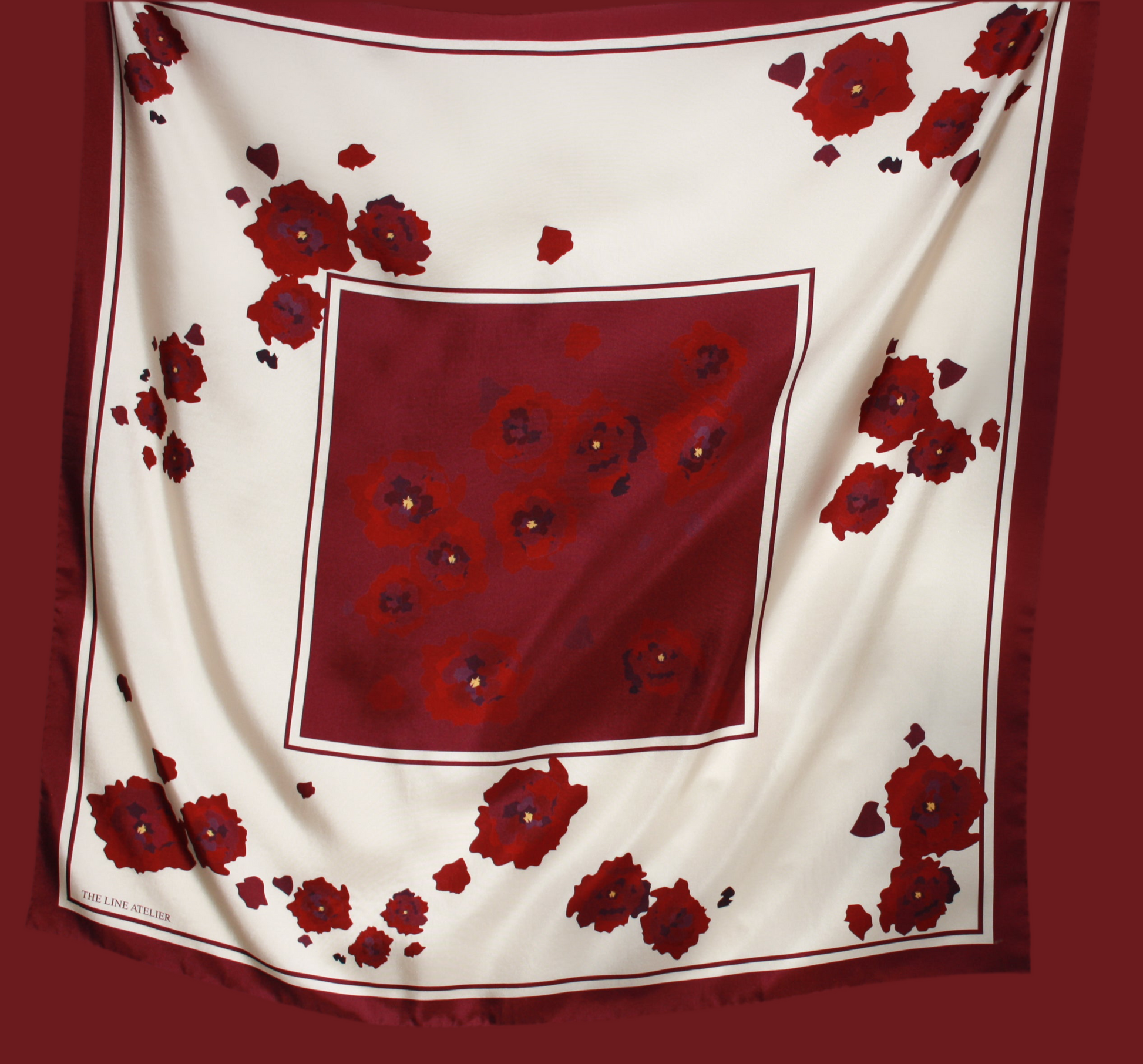 Cabernet Bloom is made for moments of calm certainty - twilight hours, meaningful glances, quiet rooms filled with presence. Across soft champagne silk, rich burgundy peonies unfurl in layered abstraction.